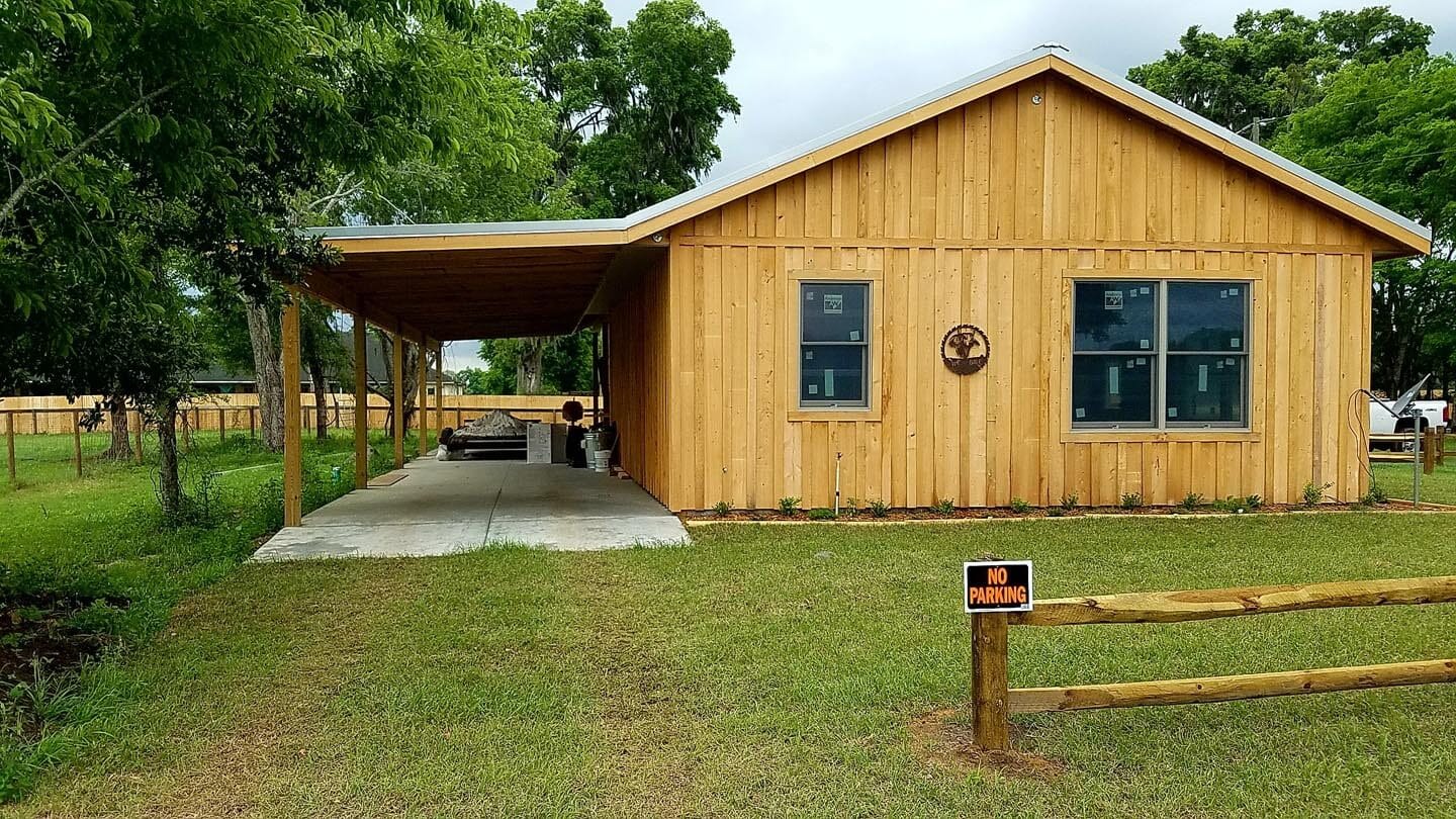 Outside view of a custom built cypress barndominium in Citra, FL